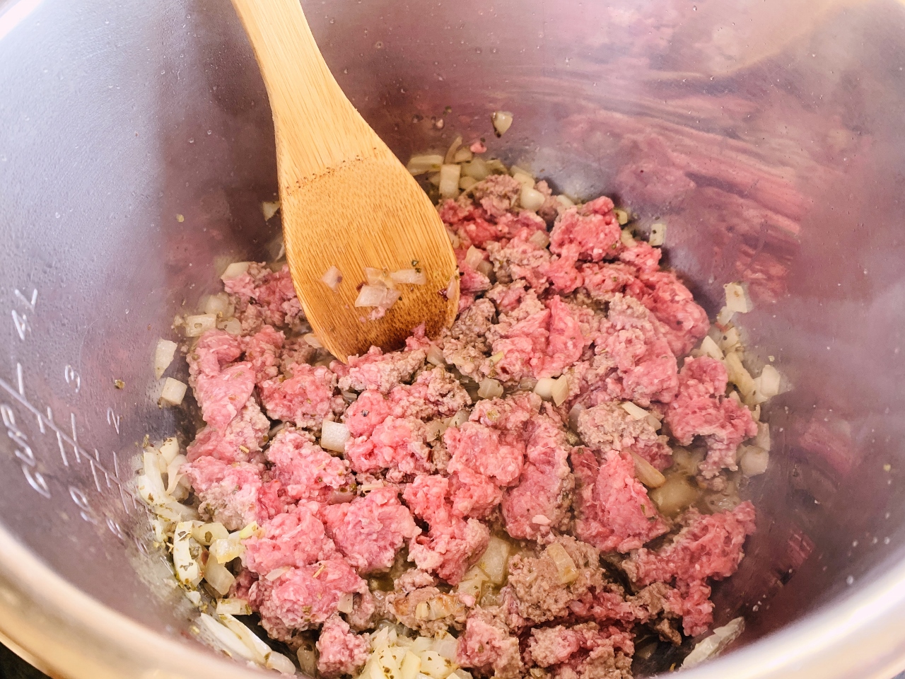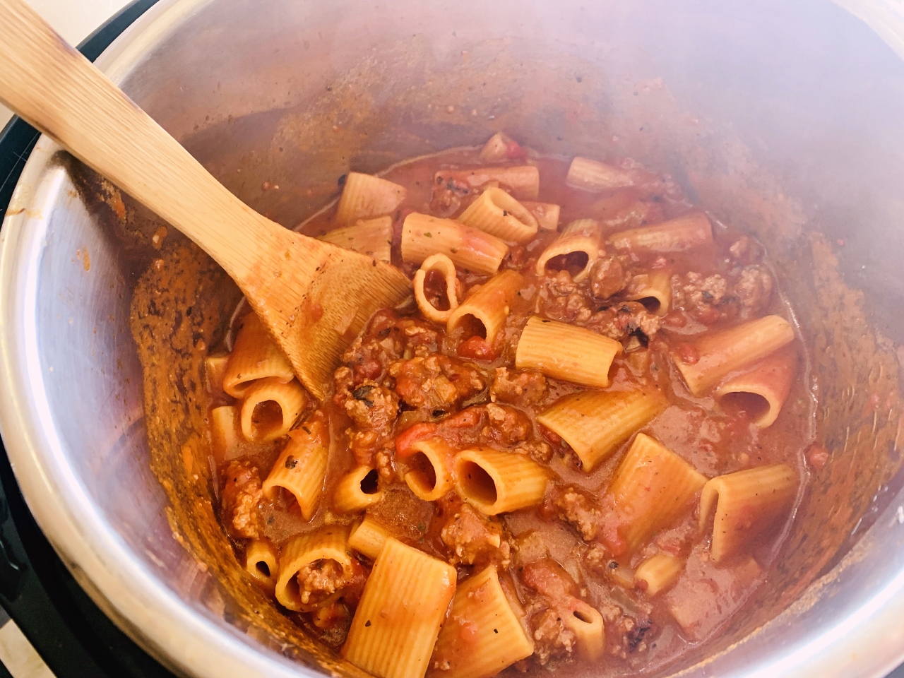 - Add ground beef and cook for 2 minutes. Add crushed tomatoes, wine, Rigatoni and water, stir. Place lid on top and cook on high pressure for 6 minutes.
