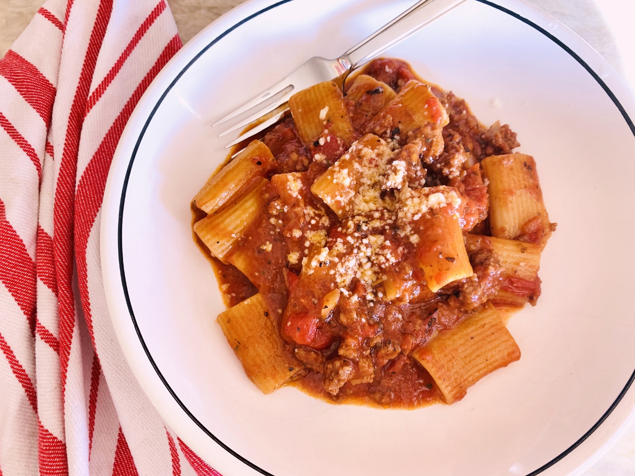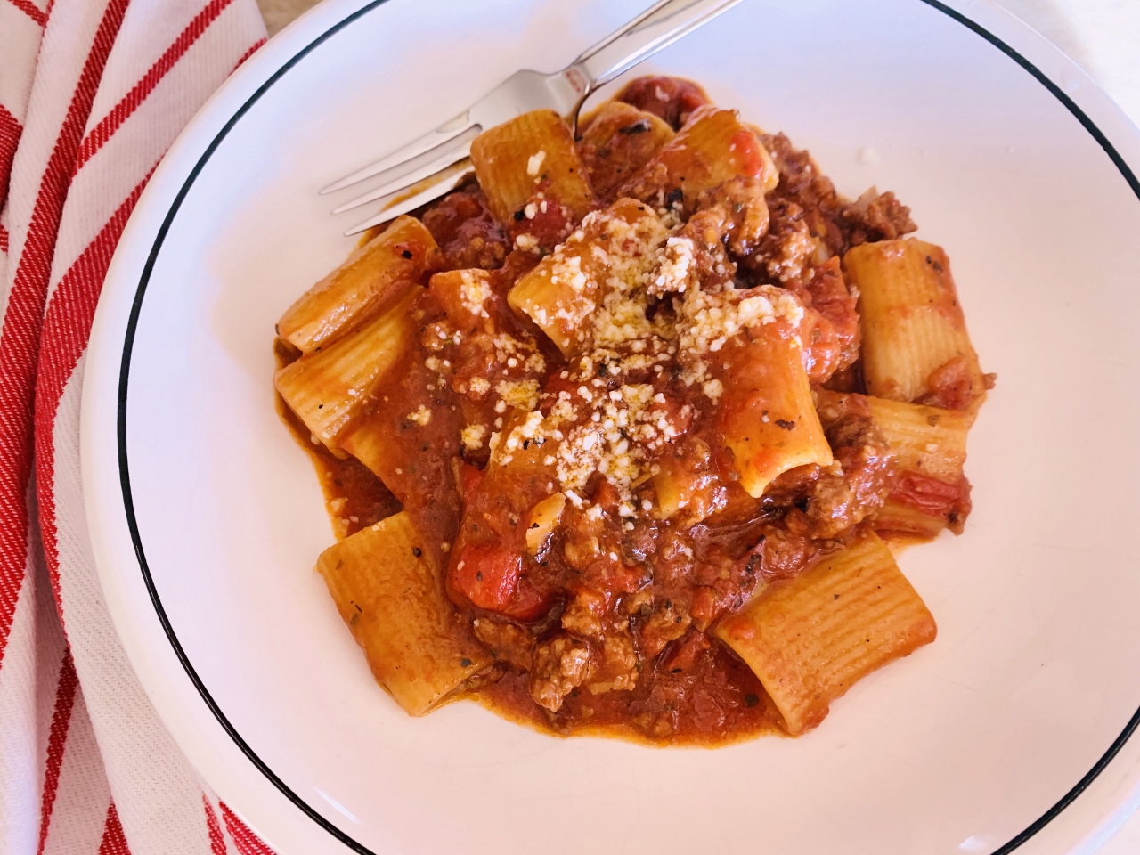 This recipe begins with pantry staples like dried pasta, canned tomatoes and dried herbs. You can even substitute jarred sauce, if that’s what you have on hand. Ground beef makes this meal hardy, but if you have ground turkey or chicken, that will work too. I added a touch of wine, but if you don’t drink, or you drank your last bottle yesterday evening, water or broth can do the trick.