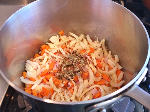 1.  Dice onion and peel and slice carrots into 1/4 inch chunks.  Slice fennel into 1/4 inch slices.