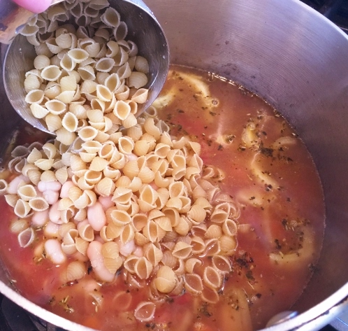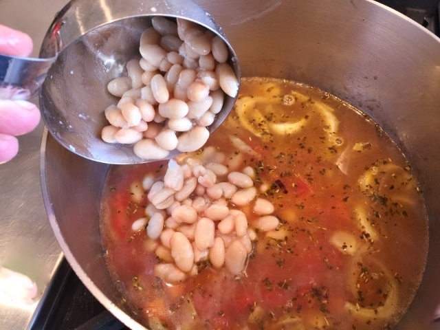 3.  Add chicken broth, diced tomatoes, cannellini beans and pasta to vegetables.