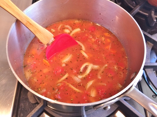 5. Place a lid on pot, leaving it slightly ajar.  Cook soup for 13 minutes, or until pasta is al dente.