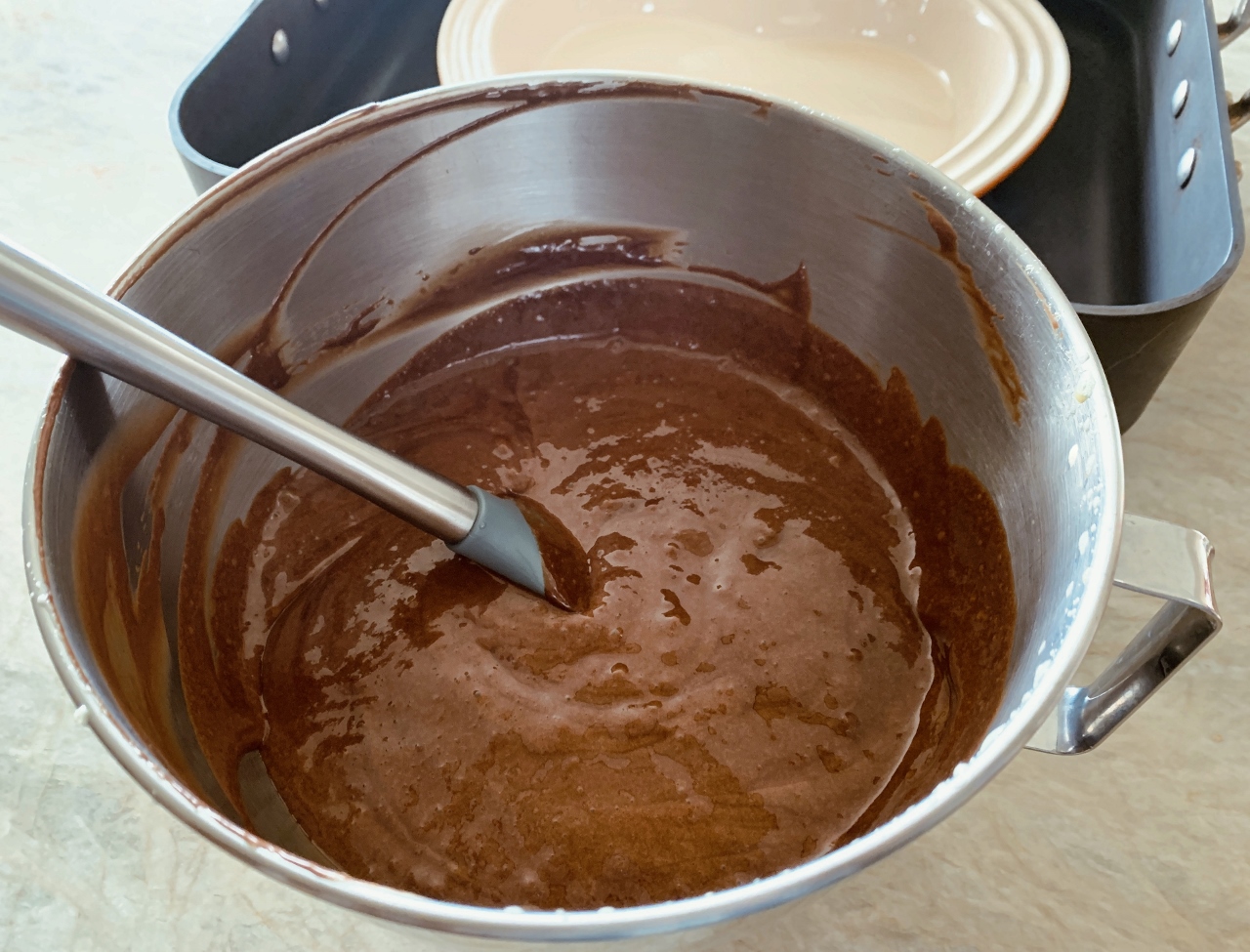 - In stand mixer or large bowl, beat eggs until frothy and slightly thickened. Add chocolate mixture and mix on low for 1 minute. Pour into prepared pan and place inside a roasting pan. Place pan in oven and fill with hot water around perimeter until it reaches halfway up sides of pan.