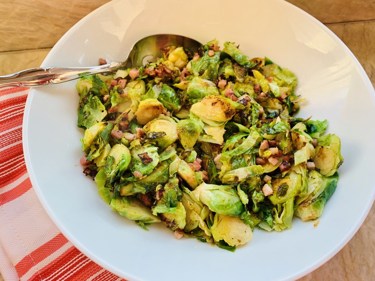Shaved Brussels Sprouts with Pancetta and a Vinaigrette Drizzle