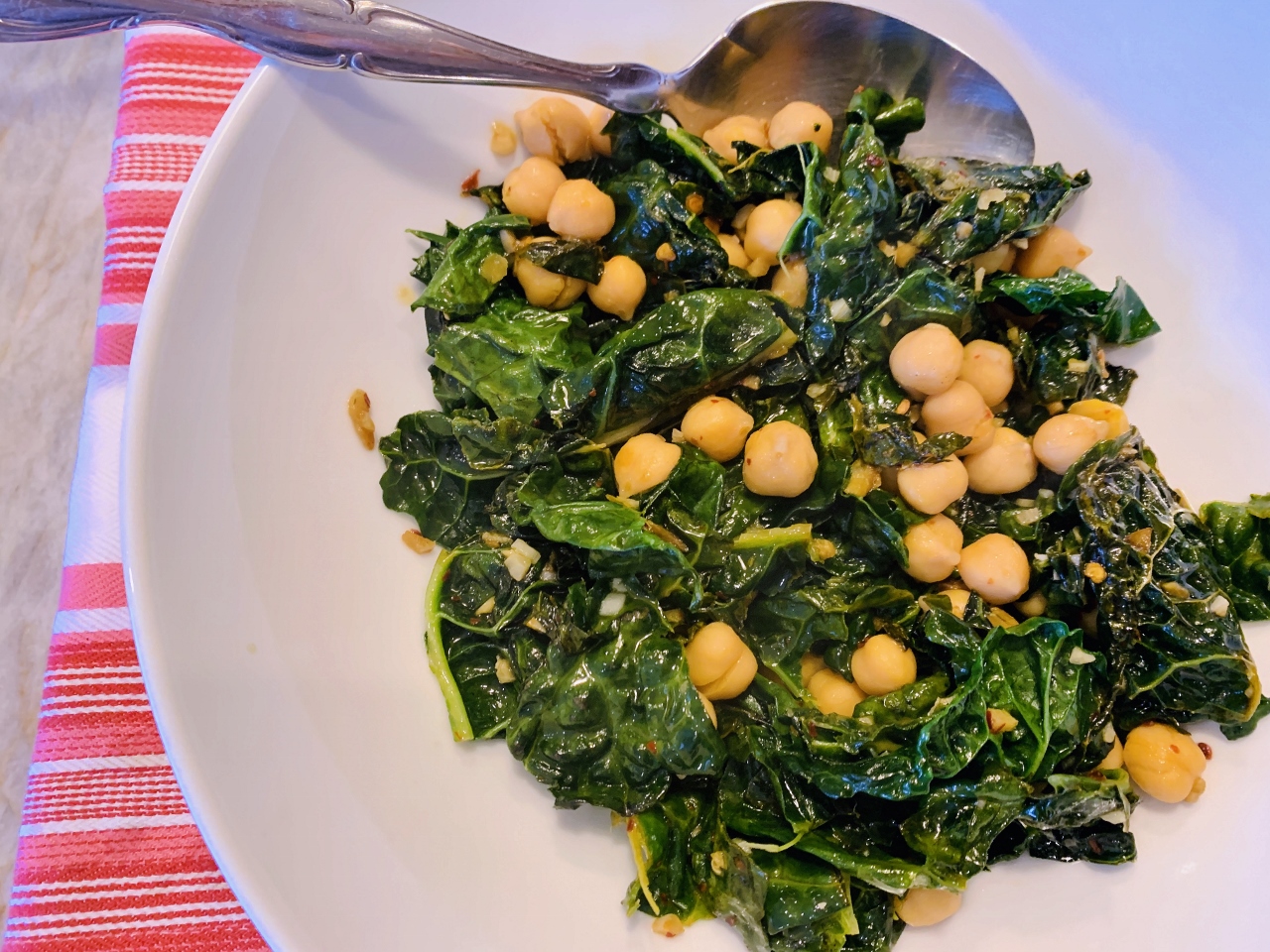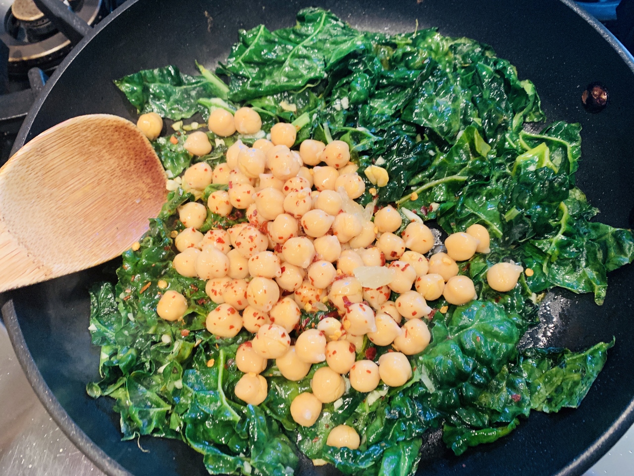 - In a large saute pan over medium heat, add 2 teaspoons olive oil and greens. Cook for 3 minutes. Add chickpeas and red pepper flakes, stir.