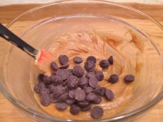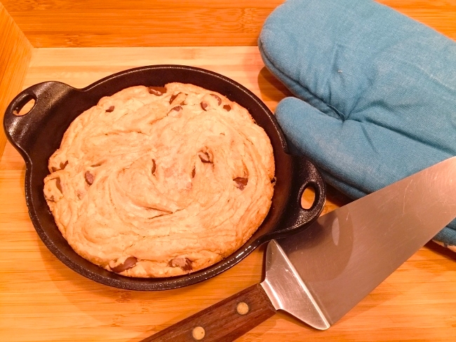 2. Add chocolate chips and stir to combine. Grease a 6-inch iron skillet with a little vegetable oil or cooking spray and spoon dough inside pan, smooth out on top.