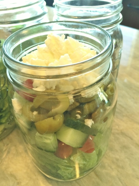 3. Let’s build the Greek Salad first. In one jar with the green leaf, add half the cherry tomatoes and half the cucumbers. Top with olives and cucumbers, followed by the feta cheese. Seal the jar, one down.