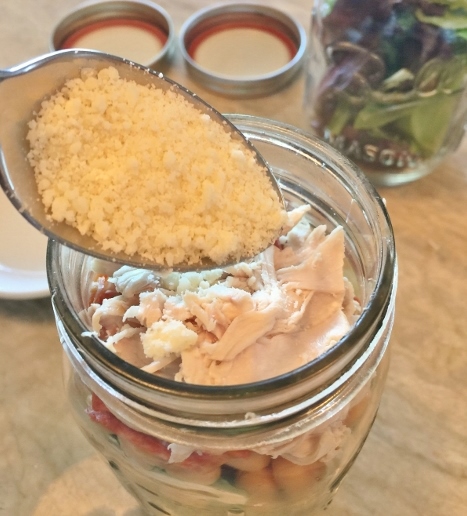 5. Let’s build the Italian Salad. On top of other green leaf lettuce jar, add other half of the cherry tomatoes and garbanzo beans. Slice salami and add on top of beans, followed by the other half of chicken. Top with parmesan cheese and seal the jar, three down.