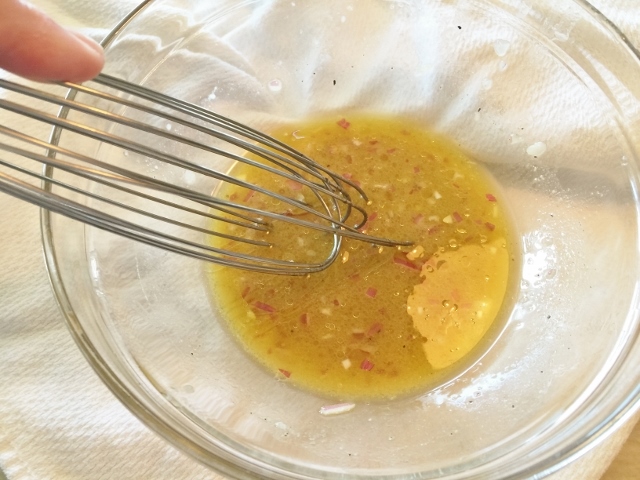7. To make vinaigrette – In a small bowl, add shallot, Dijon mustard, a pinch of salt and pepper and both types of vinegar, whisk until combined. While continuing to whisk, drizzle in olive oil. Place vinaigrette into 4 separate containers to go with the Mason Jar Lunch Salads. Enjoy!