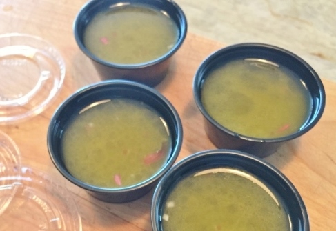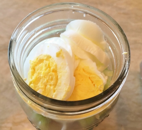 6. Let’s build the final salad – the French Tuna Salad. On top of mixed greens, add flaked tuna and capers. Chop celery and slice egg, add on top. Seal the jar, four down.
