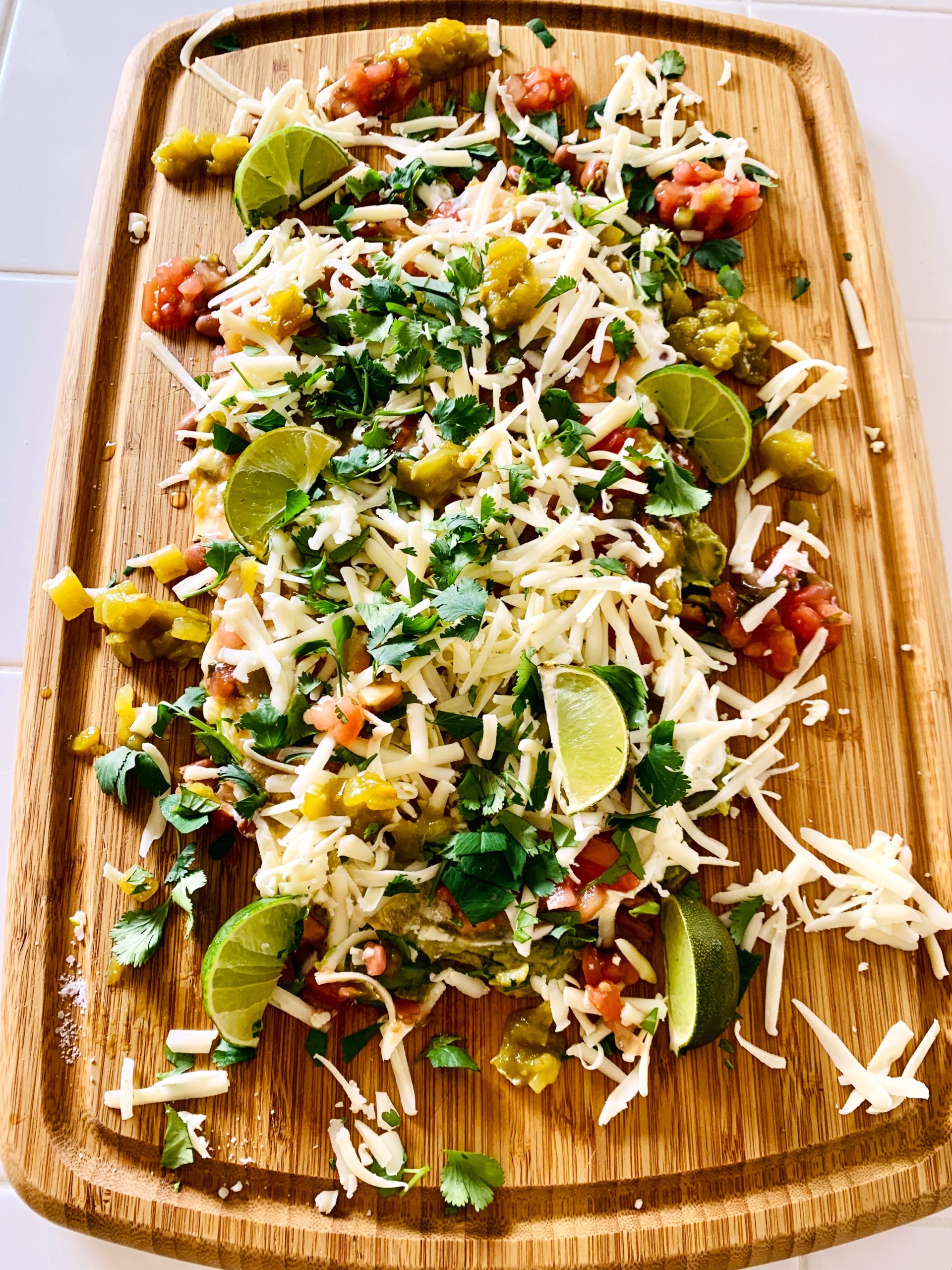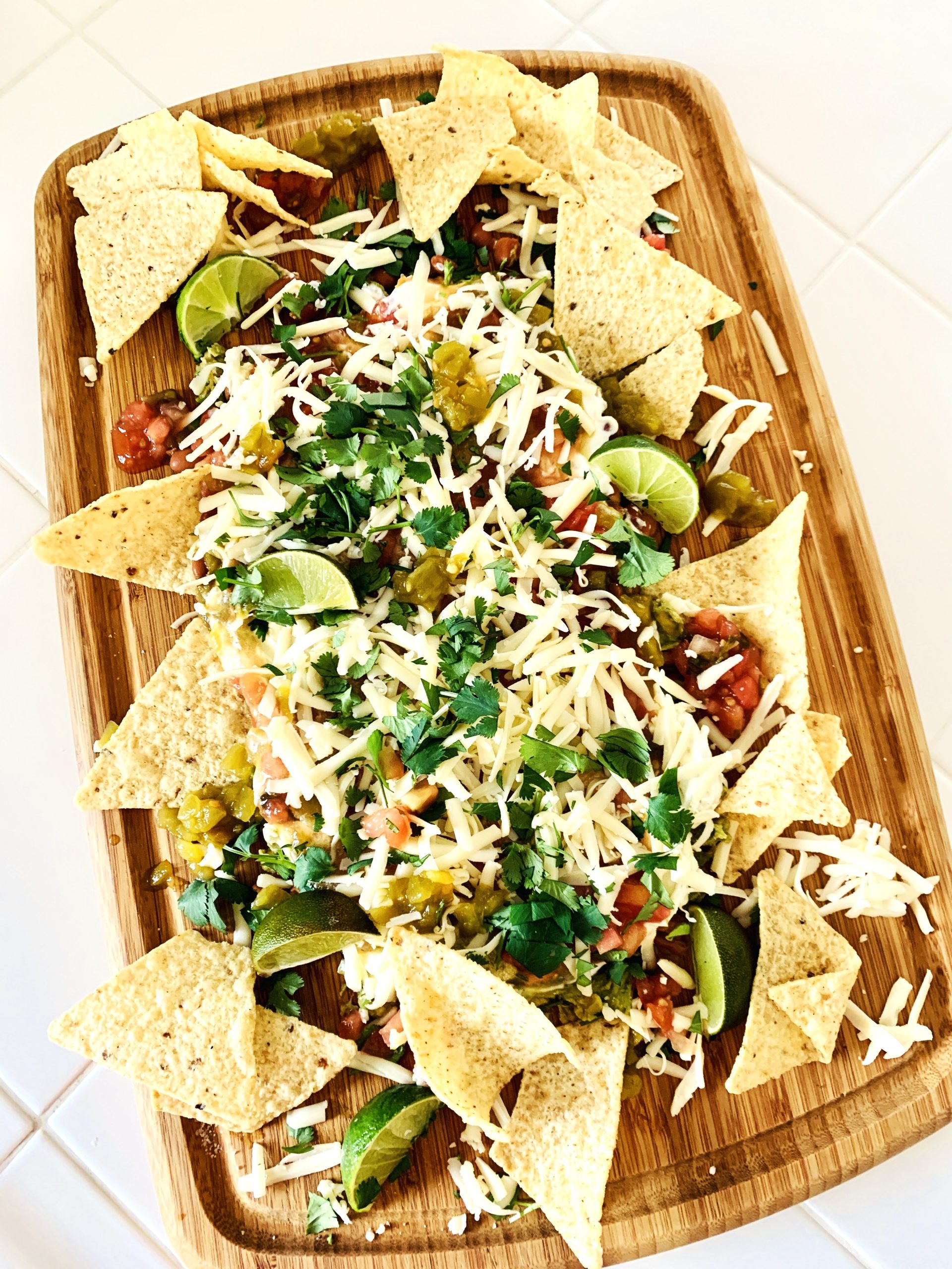 I placed corn tortilla chips around the edges with some lime wedges for presentation, but also served some more chips in a big bowl alongside of the board because there will be a lot of dipping going on for sure. This dip is a party platter to enjoy for any occasion, but especially on game-night with family and friends, or to watch your favorite sports team do their magic.