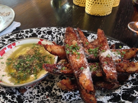 A-Frame in Culver City has been open for a while and the food still deliciously delivers  home-style comfort food with a Korean twist.  The place is always busy and the happy hour is quite the deal with 3 dollars appetizers like the Chicago Dog and Potato Skins with a dipping sauce made of buttermilk, bleu cheese and lemongrass puree.  The cocktails are a steal too with 5 dollar wine, beer and cocktails.  The Sazerac for 5 dollars is not only exceptionally prepared, but delicious.