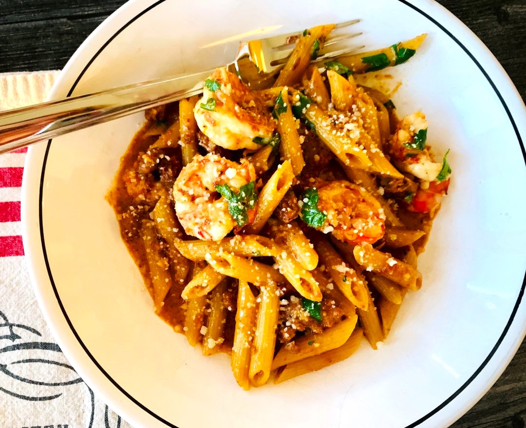 Sundried Tomato Pesto Penne with Shrimp and Sausage – Recipe!
