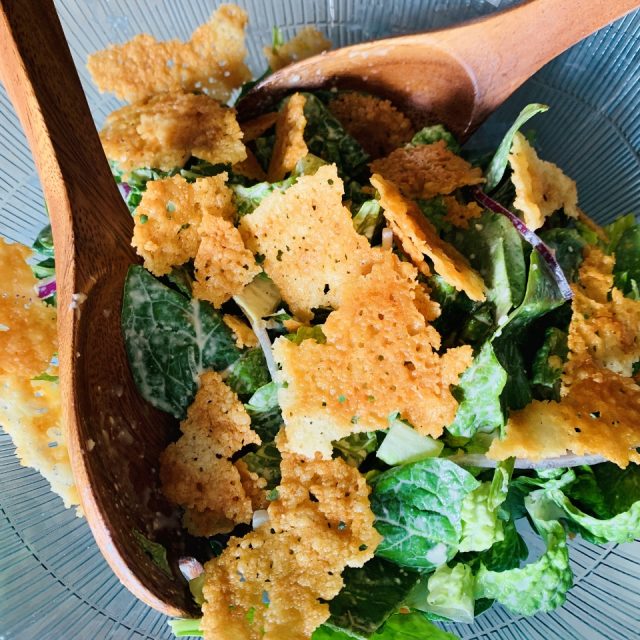 Whole-Grain Orzo with Asparagus make a tasty vegetarian meal on Wednesday evening with just a handful of ingredients. The asparagus brighten any day and make this teardrop shaped pasta even better by creating a combination that tastes like springtime. On Thursday, it’s my fabulous Caesar Salad with Crispy Frico — a change from using traditional croutons, which makes it that more crispy and interesting. You can always add roast chicken or cooked shrimp for a boost of protein to the salad.