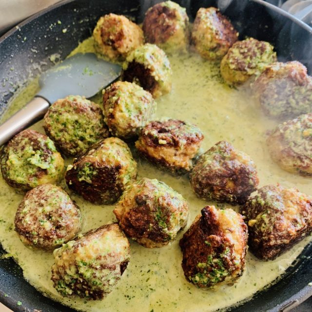 Turkey Meatballs with Creamy Arugula Pesto Sauce – Recipe!