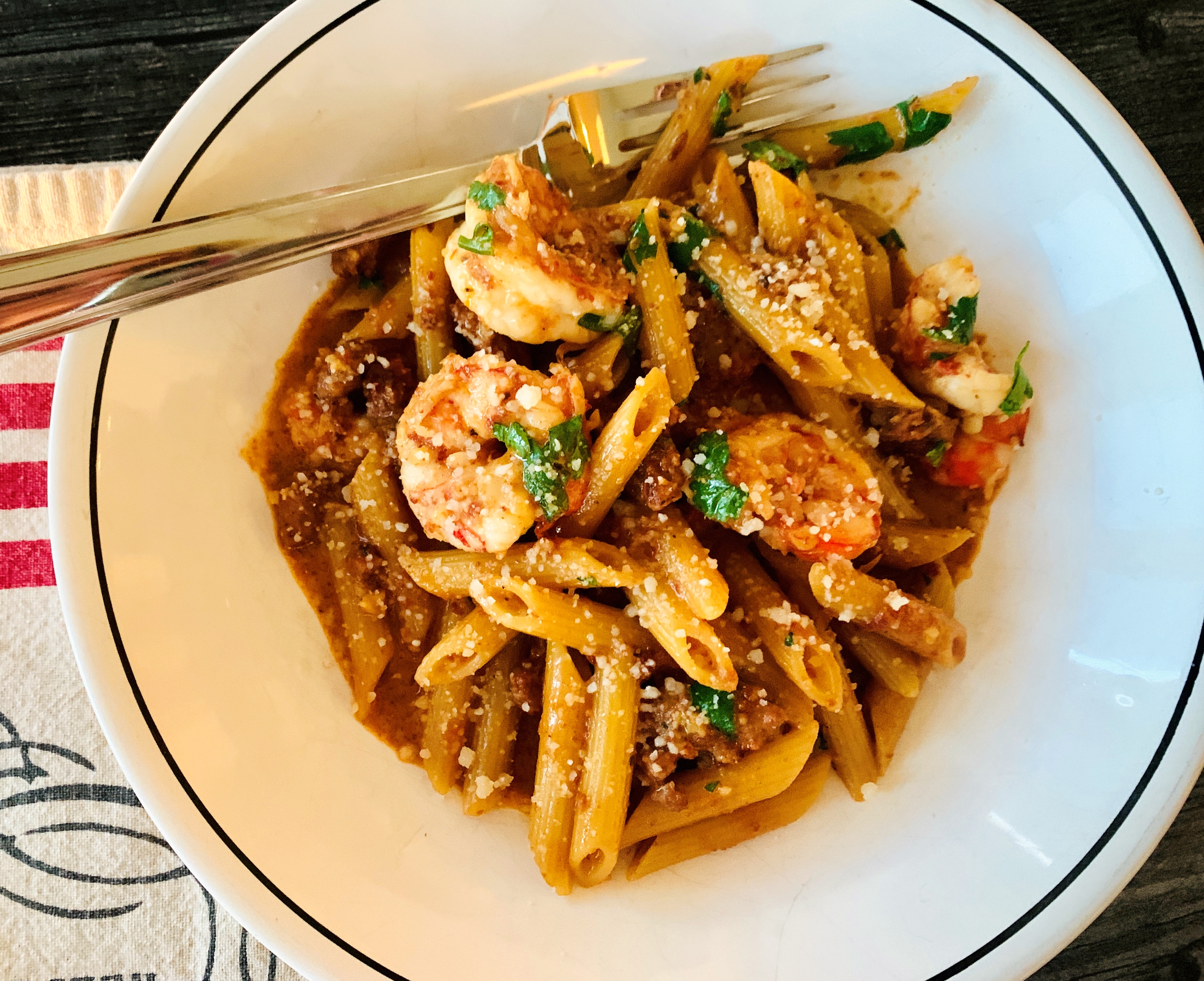 Sundried Tomato Pesto Penne with Shrimp and Sausage – Recipe!