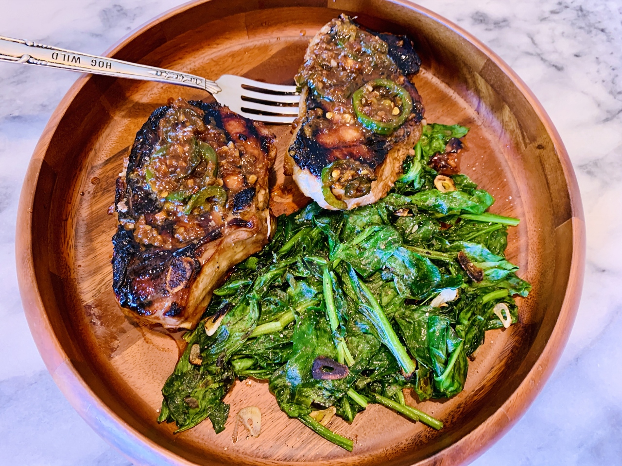 Grilled Marinated & Sauced Pork Chops with Garlicky Spinach – Recipe!