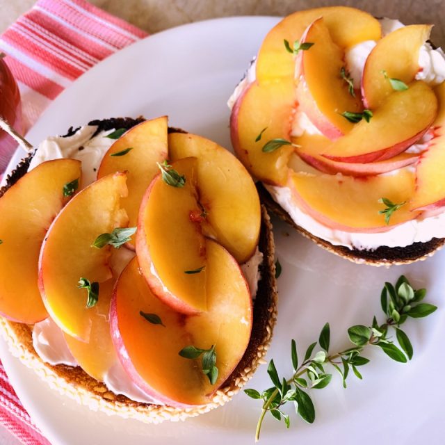 Saturday – Fresh peaches with a drizzle of honey served on top of a toasted bagel with a big smear of cream cheese, or goat cheese.