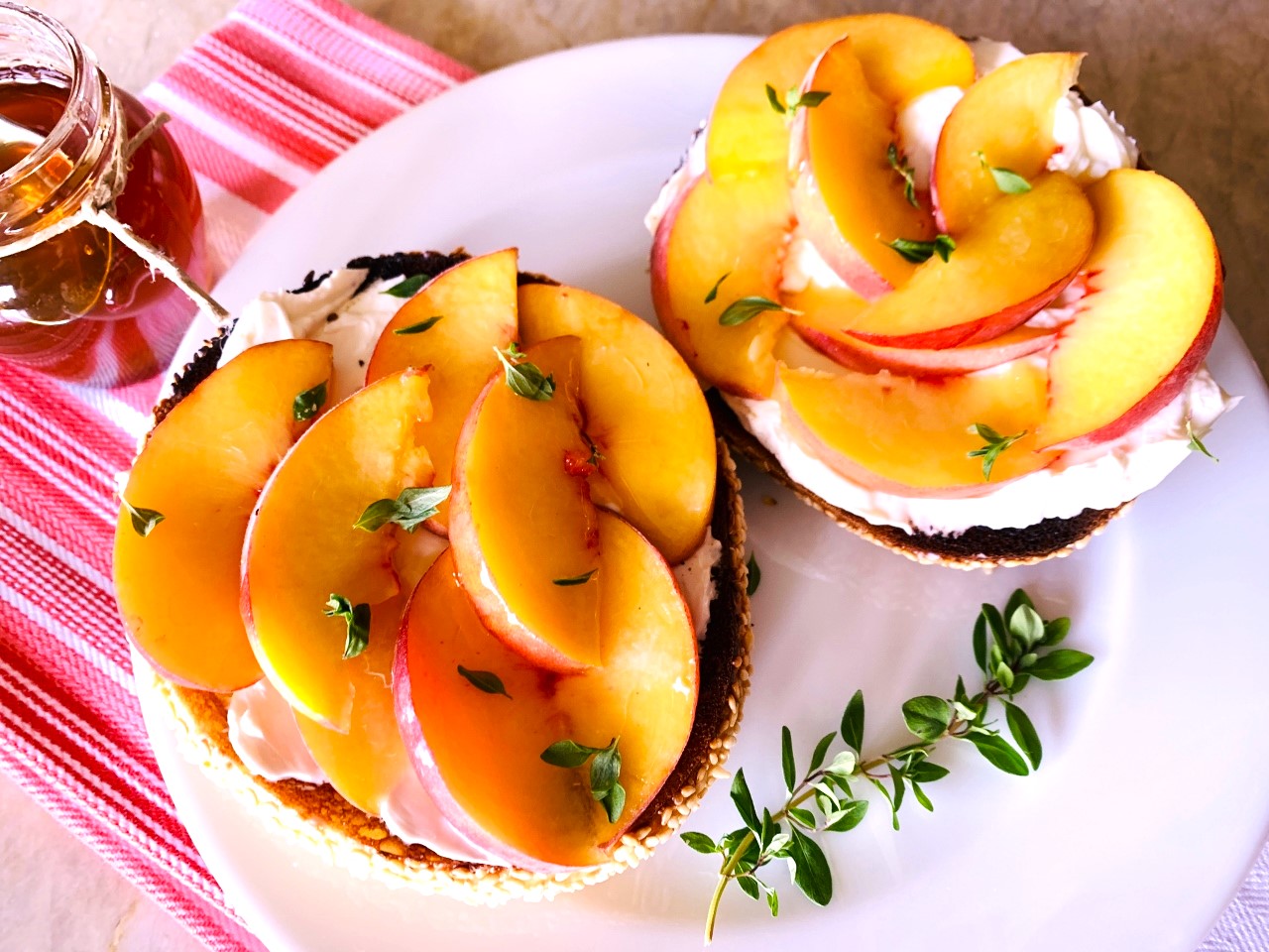 Saturday – Fresh peaches with a drizzle of honey served on top of a toasted bagel with a big smear of cream cheese, or goat cheese.