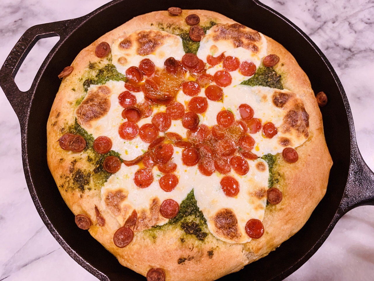 Deep Dish Skillet Pizza with Arugula Pesto and Pepperoni – Recipe!