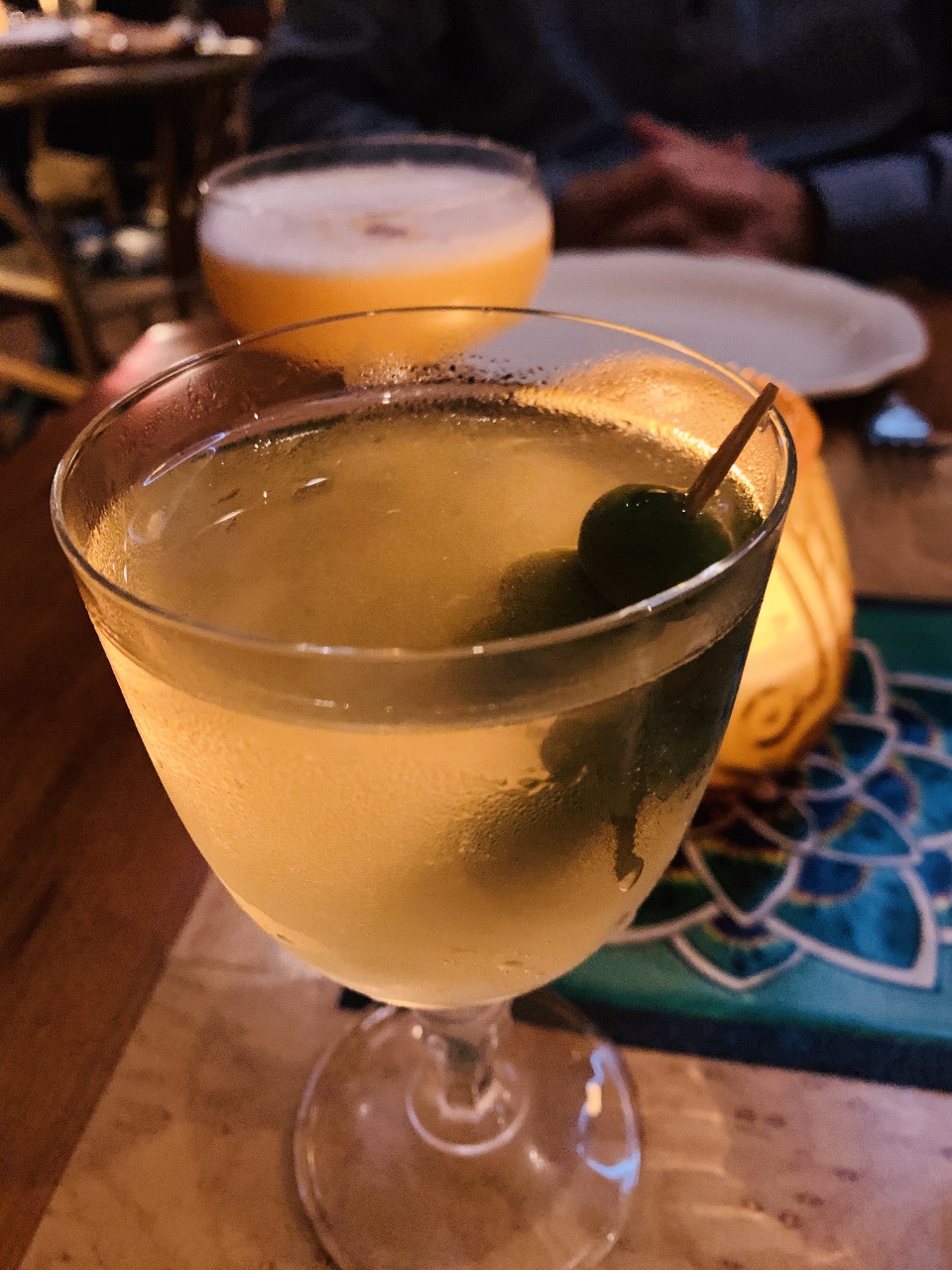 Start with cocktails, like a classic Dirty Martini with Bay Infused Vodka, or a Whiskey Sour made with a splash of Sarsaparilla, a liquor tasting of root beer. If you get a seat in the bar, you may need to stay put because of the crowd, or sachay into the real restaurant for a table.