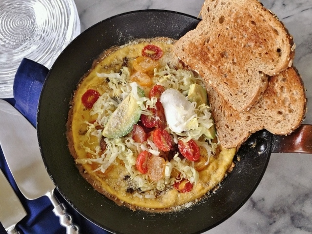 4. Â Remove from the oven and top with shredded lettuce, the other half of the tomatoes and bacon. Â Sprinkle the frittata with Parmesan cheese and top with sliced avocado and dollop of sour cream. Â Serve with toast, if desired. Â Enjoy!
