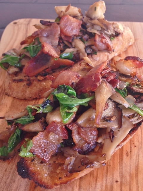 6. Add fresh thyme leaves to mushrooms and stir to combine, continue to cook for 1 minute. Add arugula and juice of half a lemon to mushrooms and stir to combine. Stir in bacon into mushroom mixture and turn off heat. Pile Maitake mixture onto toasts and serve immediately. Enjoy!
