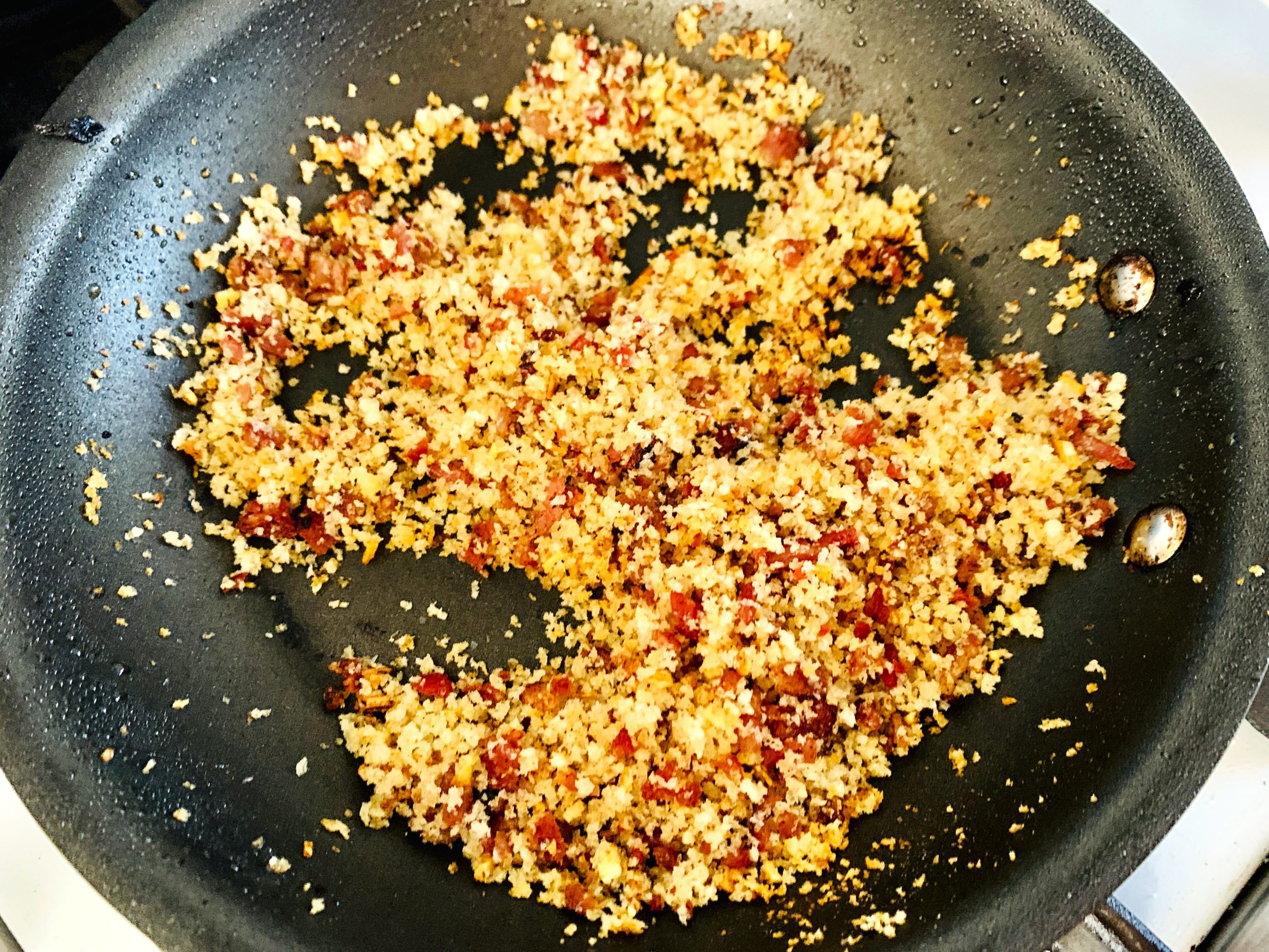 - Add butter to pan and melt over medium heat. Add garlic and stir. Cook 30 seconds and add Panko, stir. Add bacon crumbles and stir.