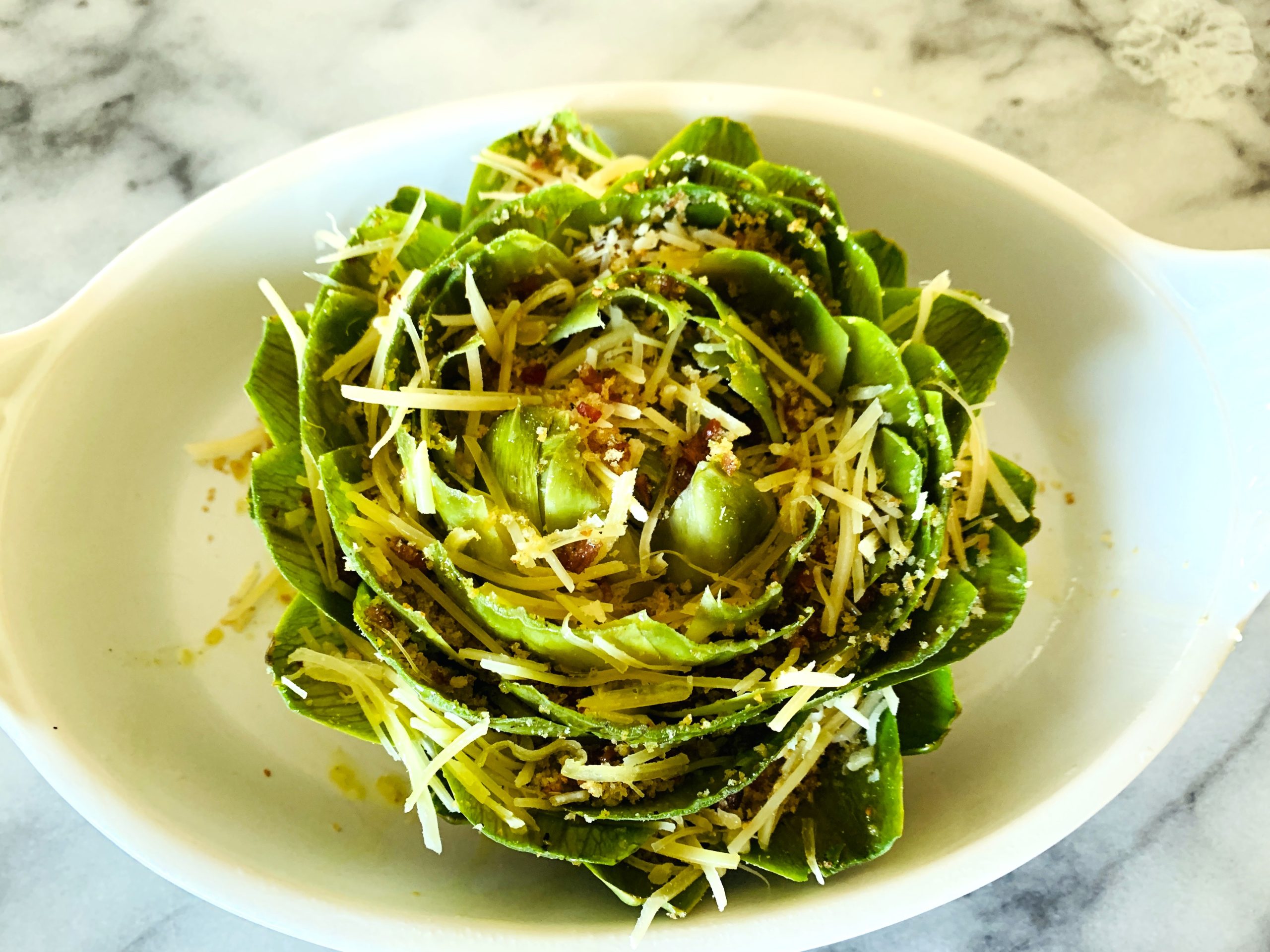 Being raised a Southern Californian, we always ate artichokes. Some of the best artichokes are grown in the Central Valley of California, and these plump and vibrant green vegetables are great when steamed first, and then loaded with some of my favorite things to create this Bacon Parmesan Breadcrumb Stuffed Artichoke.