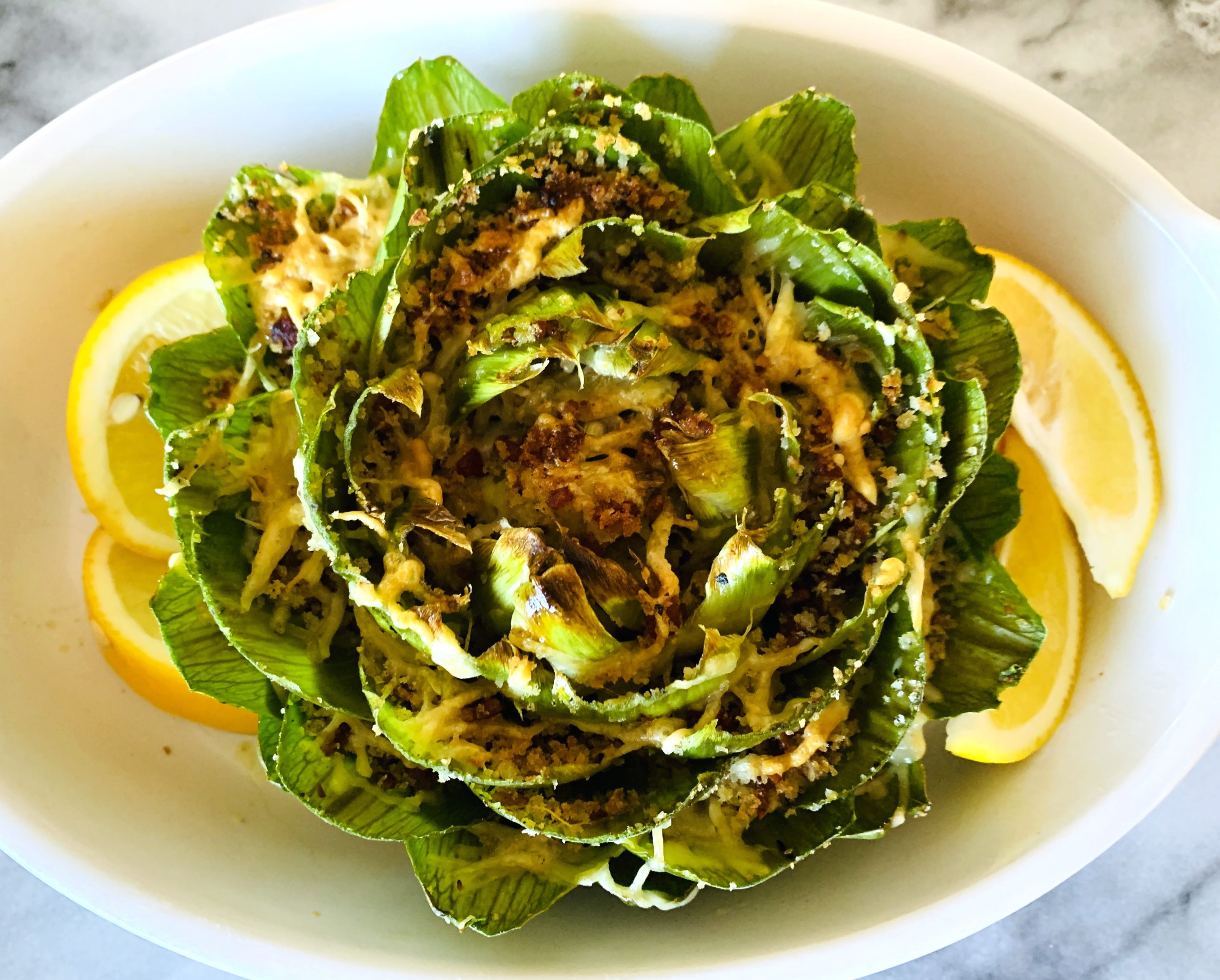 While the artichoke is cooling, sizzle up some bacon in a skillet and drain most of the fat, leaving about a teaspoon. Chop the bacon into fine pieces and set aside. Toast panko breadcrumbs with some garlic in the bacon fat and a pat of butter (you want to build flavor at this point) until golden brown. Add back the bacon crumbles and stuff into the artichoke leaves before adding some shredded parmesan. Broil for 5 minutes or so, just until the cheese is melted and some of the tips begin to char. Remove and squeeze lemon juice over top. Artichokes are such a tasty treasure and they are fun to share as a meal with a friend, or to serve as an appetizer beforehand.