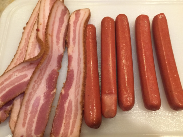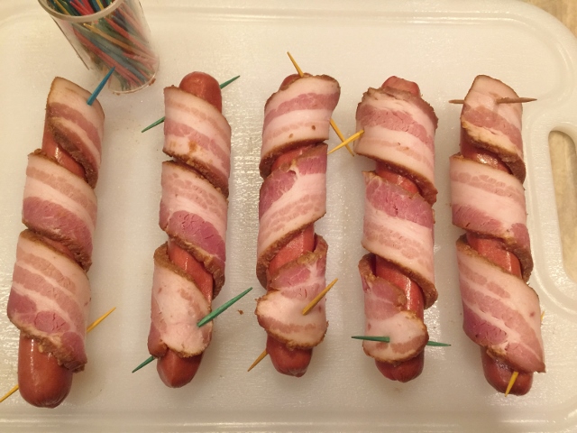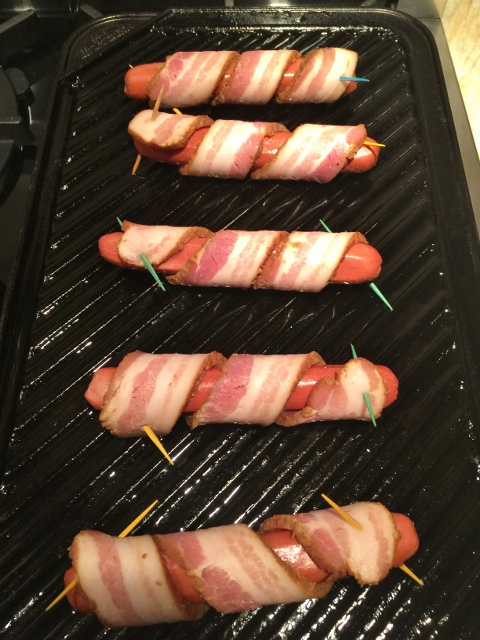 1. Remove hot dogs and bacon from packaging.  Wrap a slice of bacon around each dog and secure at ends with toothpicks.