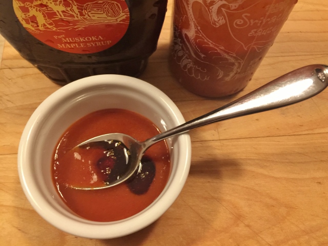 2.  Place your grill pan over medium high burners.  In a small bowl, combine Sriracha and maple syrup, stir to combine.  Place dogs on grill and cook for 3 minutes, rotate a third of a turn and brush with sauce.  Repeat twice more, until dogs are crispy brown on all sides.