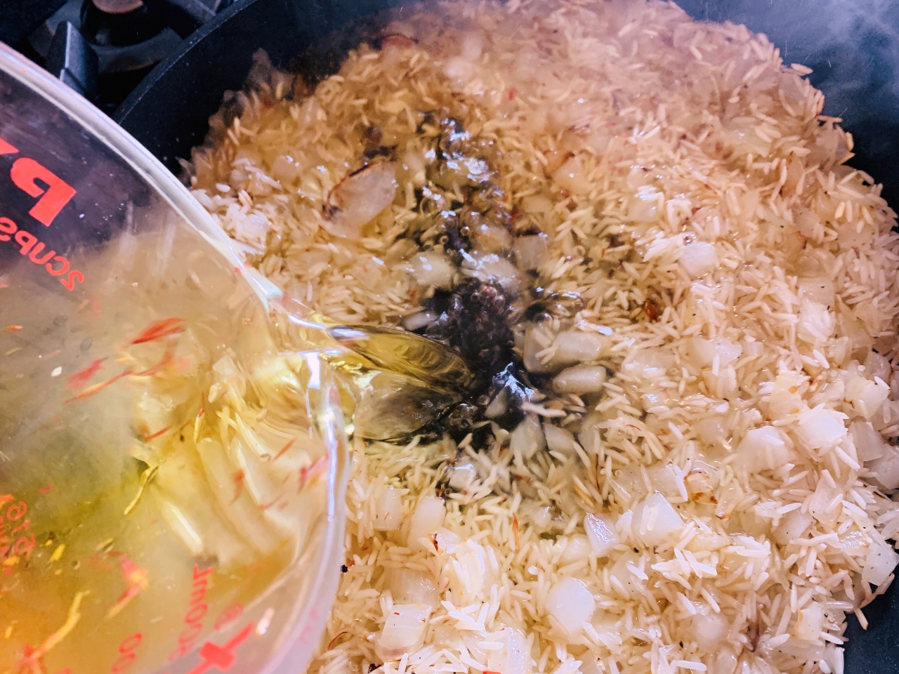 3. Add onion, 1/2 teaspoon salt and 1/4 teaspoon black pepper, stir.  Cook for 3 minutes.  Add rice and stir to combine.  Cook for 1 minute to toast grains slightly.
