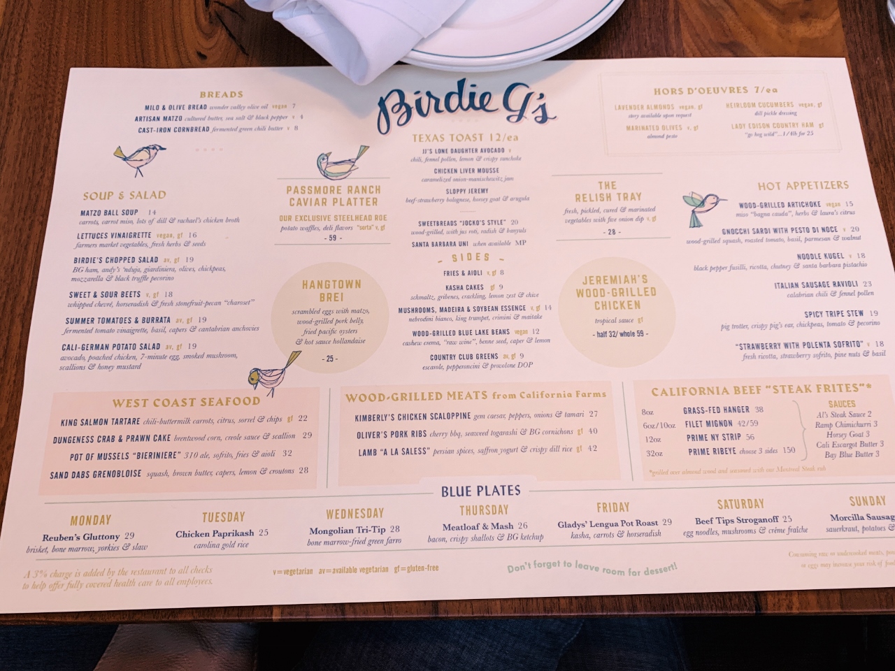 Birdie G’s is Chef Jeremy Fox’s new Santa Monica restaurant with a grand-diner sort of feel, named after his daughter and grandmother.  His Midwest roots and Jewish heritage are on full display in his kitchen, offering everything from a daily Blue-Plate Special to Matzo Ball Soup, and prime cuts of Steak & Frites.  The atmosphere is bustling, while pleasant – the perfect place to find something enjoyable for dinner.