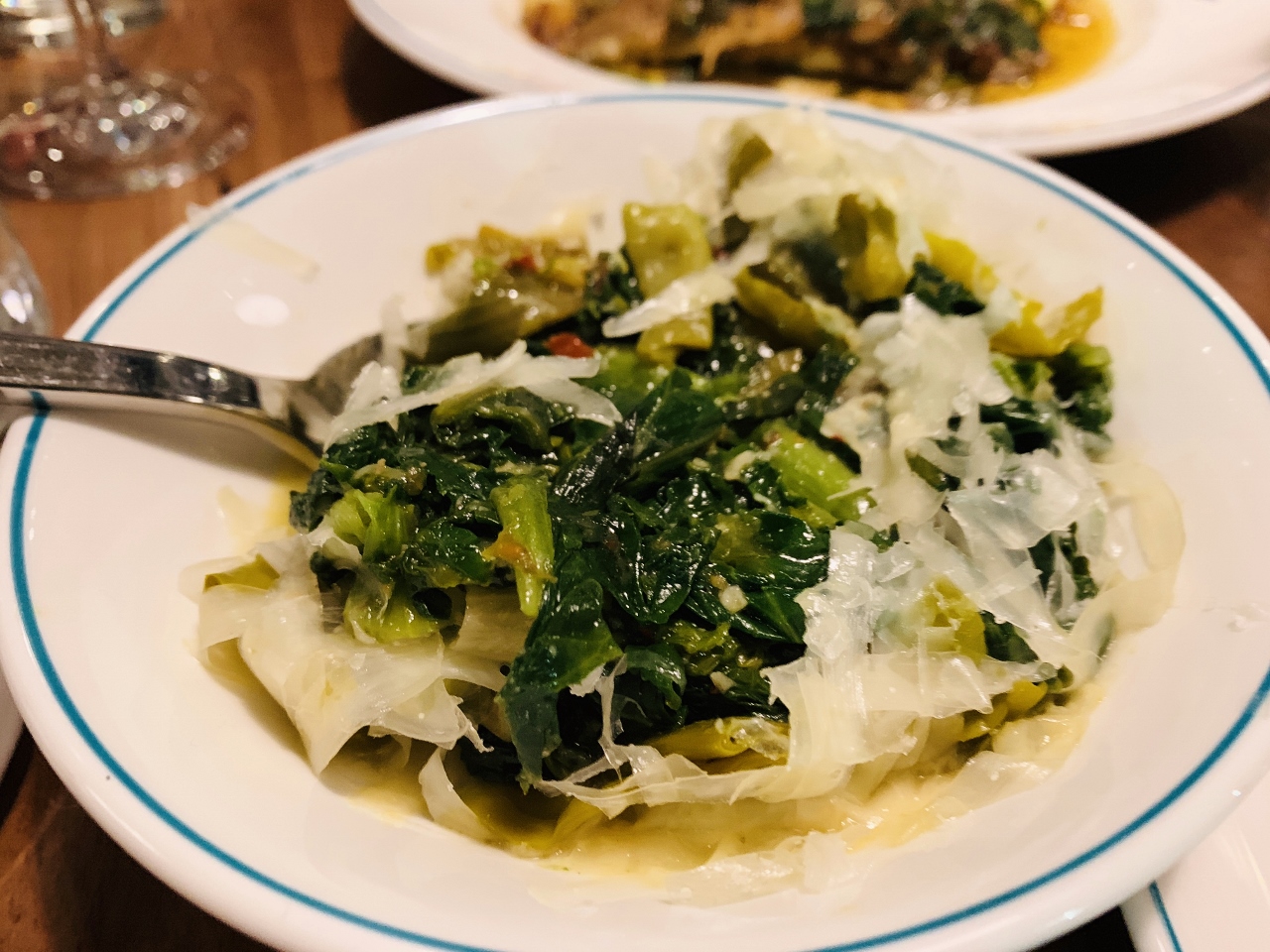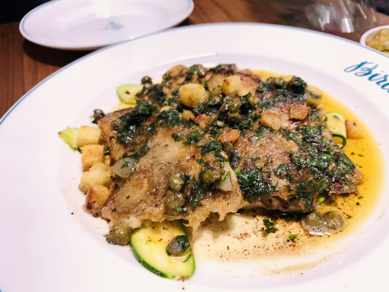 Sand Dabs with Brown Butter, Caper and Lemon with tiny Croutons were cleverly fancied because of the incredible texture and tang in a rustic presentation.  A side of Country Club Greens of Escarole, Pepperoncini and Provolone sauteed until soft and creamy with a mild melty cheese made me happy.