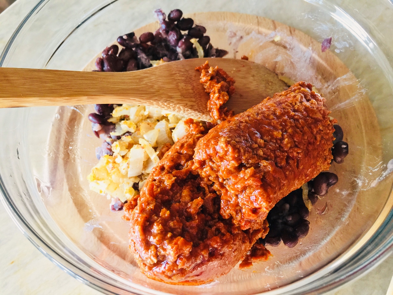 3.  Grate cheese and cut off end of soy chorizo packaging.  Add onion mixture and soy chorizo to beans, stir.