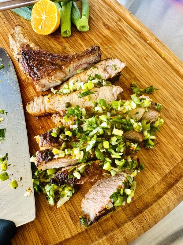 - Remove chop and let rest for 7 minutes before topping with gremolata and slicing. Enjoy!