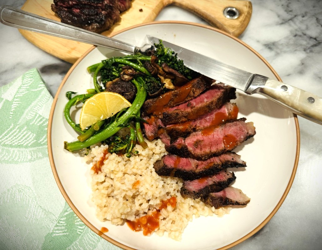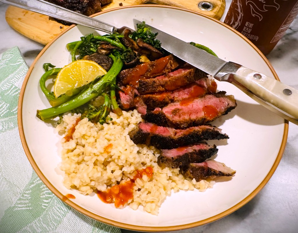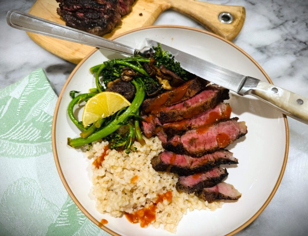 A good steak like a Ribeye or New York are what I recommend to create a steak bowl. They may be slightly higher in price, but when you slice and serve them in multiple portions, the cost balances out with the other ingredients. Broccolini and Shiitake mushrooms are a delicious pairing, especially when stir-fried and seasoned with that same blackened dry rub.