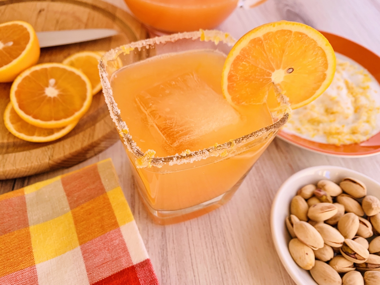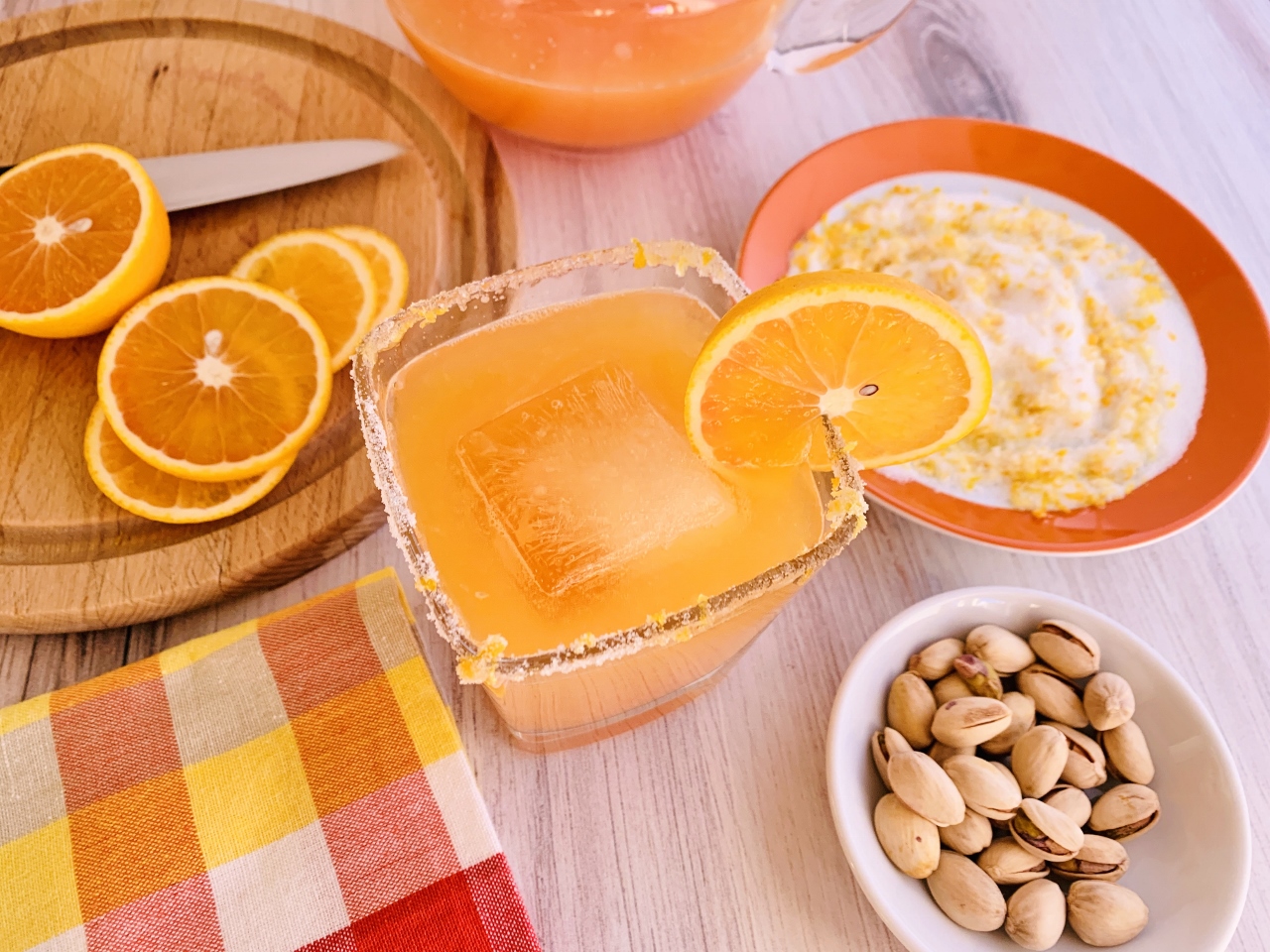 - Fill glasses with a large ice cube or smaller cubes. Mix zest with sugar. Slice remaining blood orange crosswise. Wet rim of glass with orange slice. Dip each glass rim into sugar mixture.