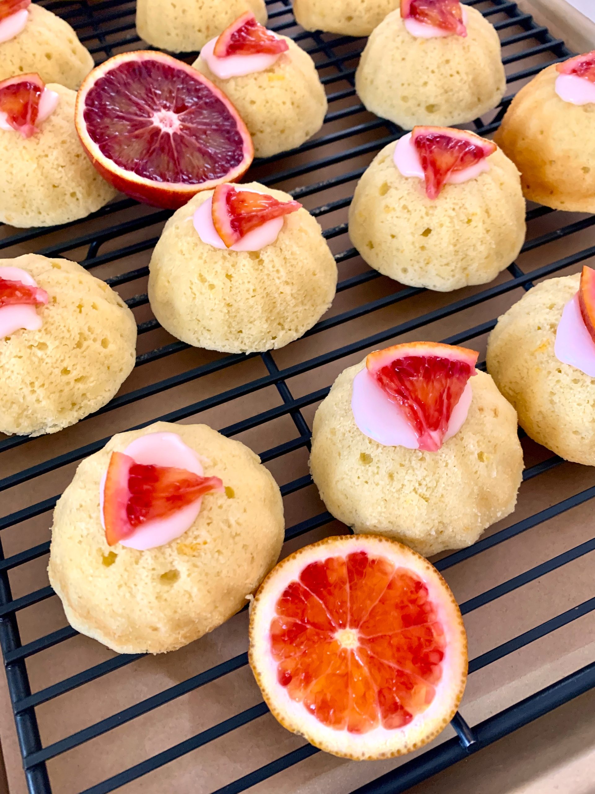 - Mix glaze ingredients in a bowl until creamy. Dollop a spoonful of glaze over top and place a blood orange triangle on top, if desired. Enjoy!