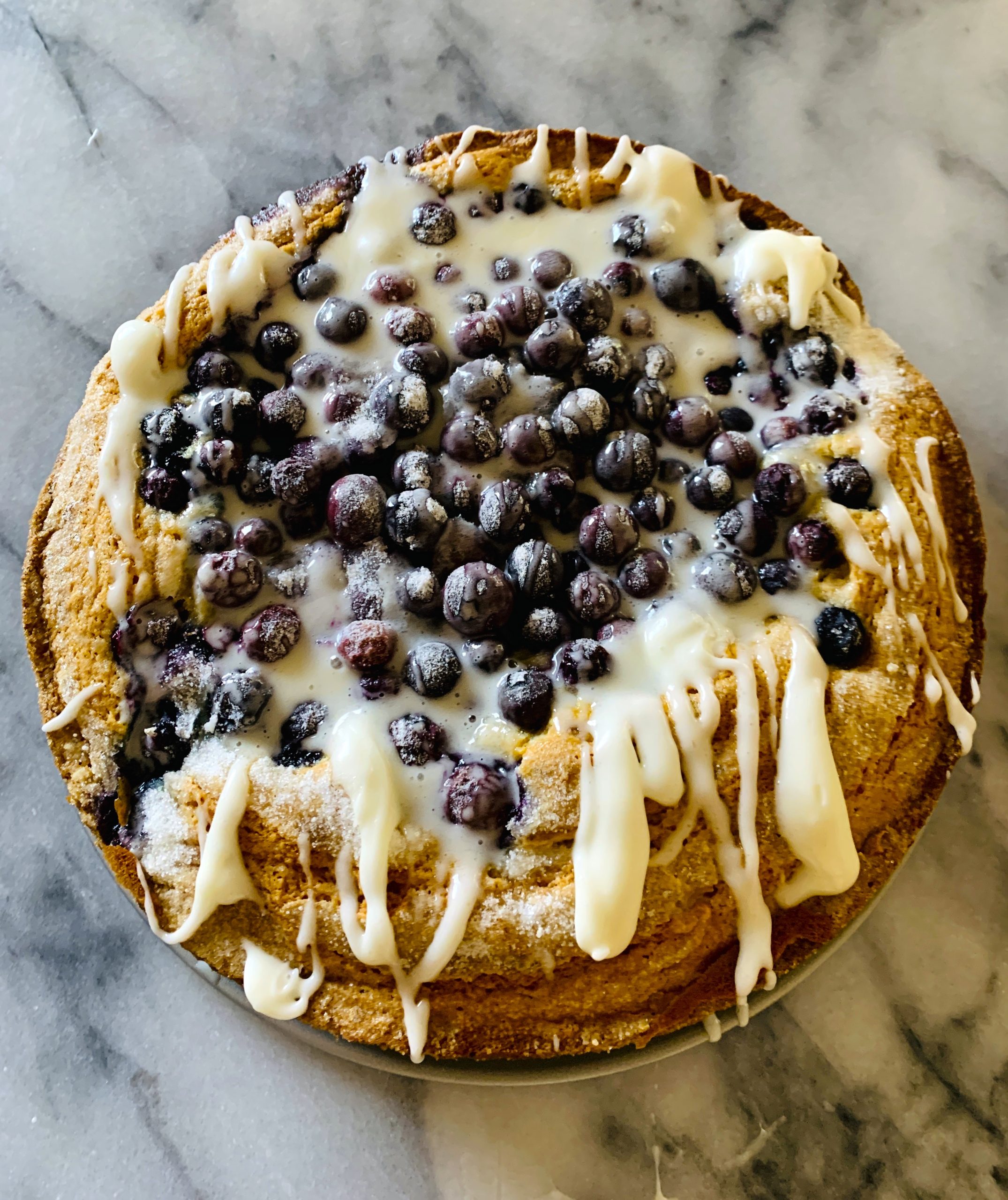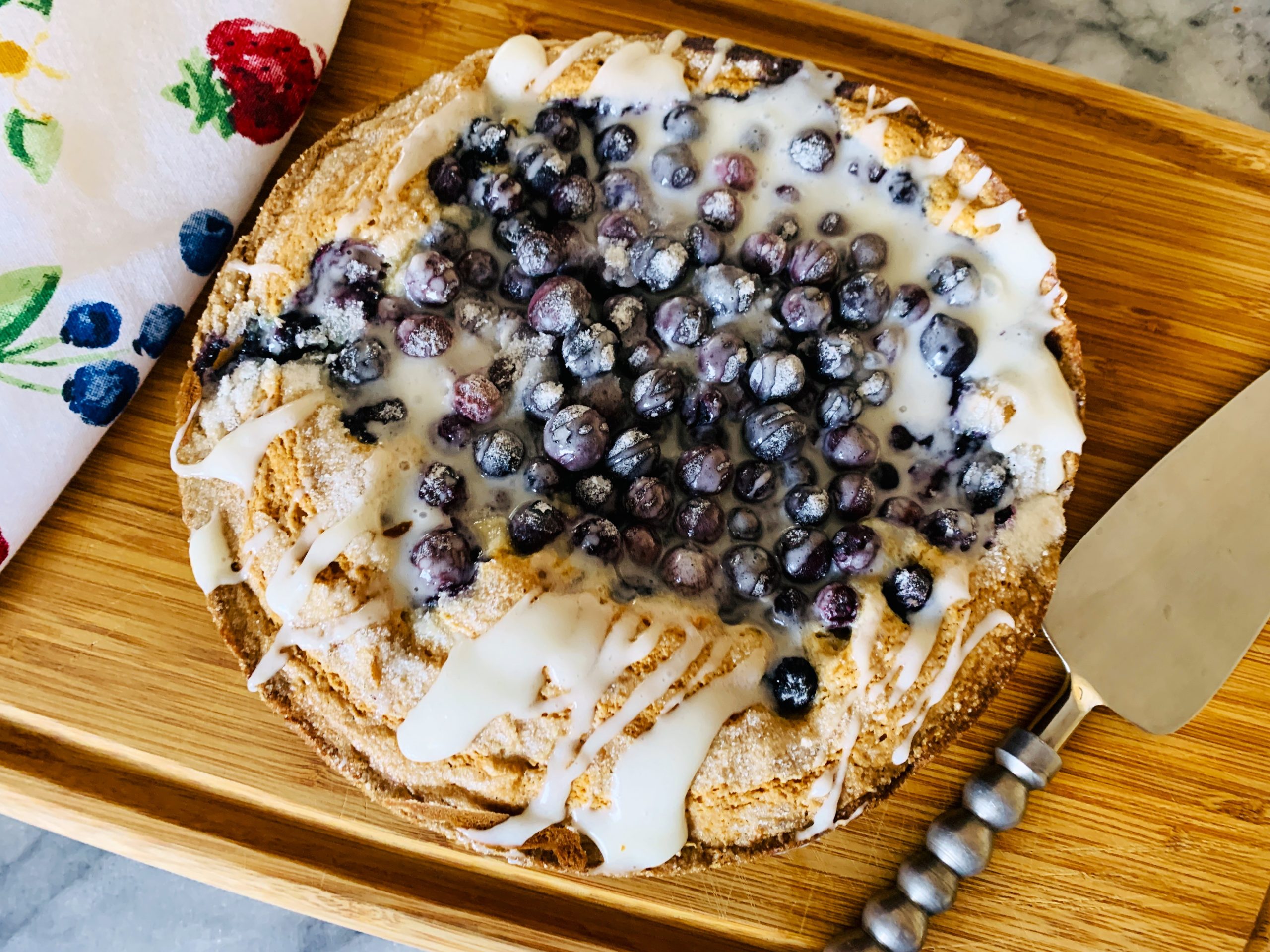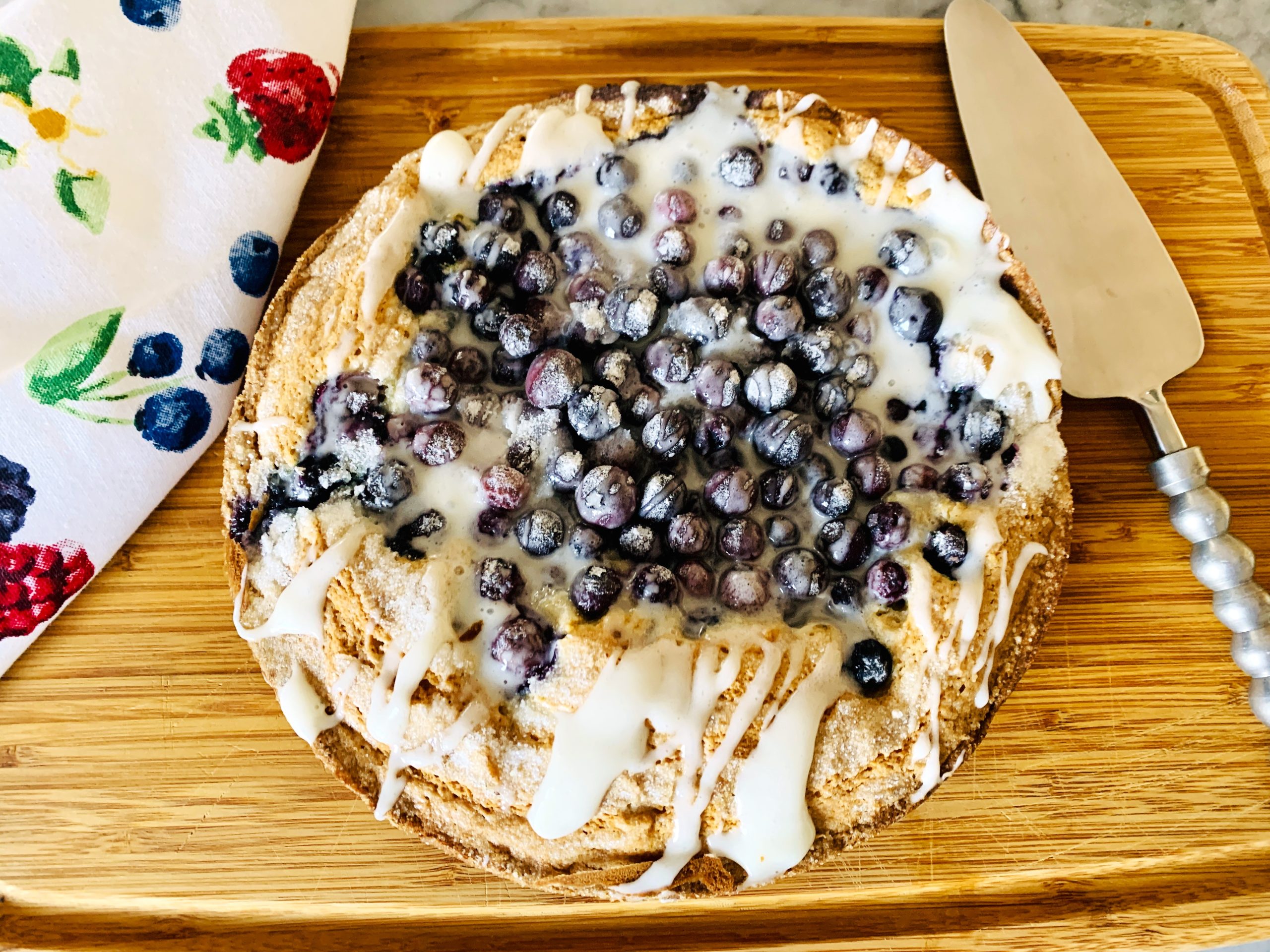 - In a medium bowl, add blueberries, sugar and flour, toss with fingertips. Spread on top of center of cake, adding all remaining sugar and flour.