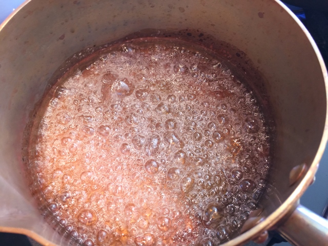 1. In a copper or stainless steal pot, add sugar and 1/2 cup of water. Stir to combine mixture and place over medium high heat, do not stir again. Cook sugar for 8-10 minutes or until bubbles start to enlarge and turn an amber color.