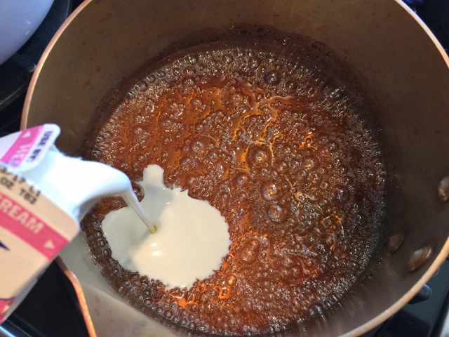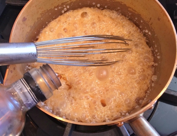 2. Remove from heat and pour in heavy cream. Whisk immediately until smooth. Sauce will foam and rise slightly, but keep whisking.