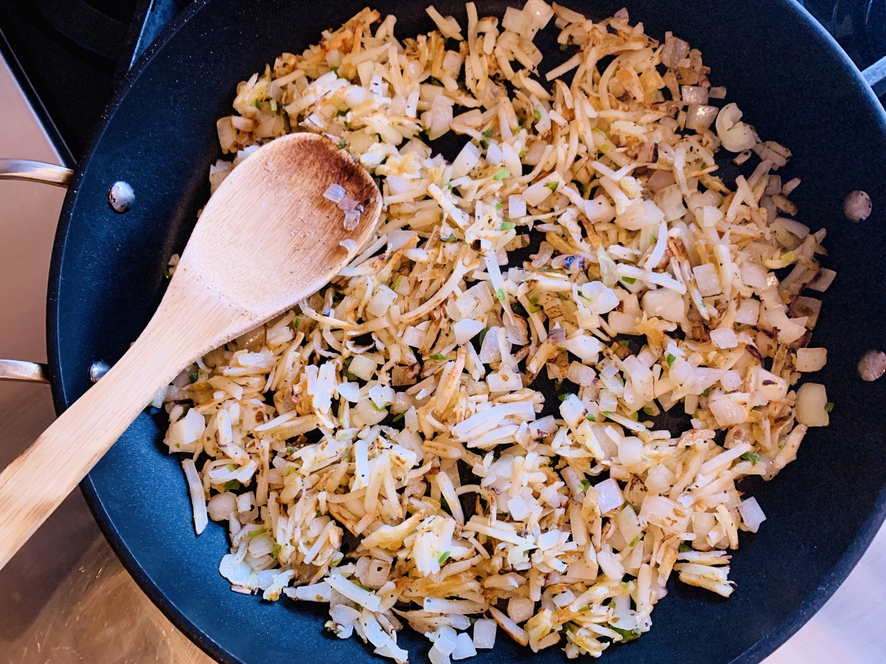 - In a large sauté pan over medium-high heat, add 2 tablespoons vegetable oil. Add hash browns and cook for 2 minutes, breaking a part with spoon as you stir. Add onions, onion powder, jalapeno, 1 1/2 teaspoon salt and 1/2 teaspoon black pepper, stir. Cook for 5-7 minutes, until hash browns are lightly browned. Remove and place in a bowl, set aside.