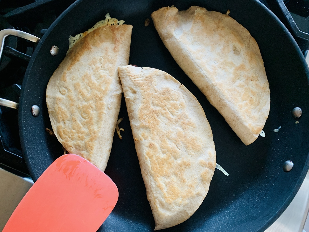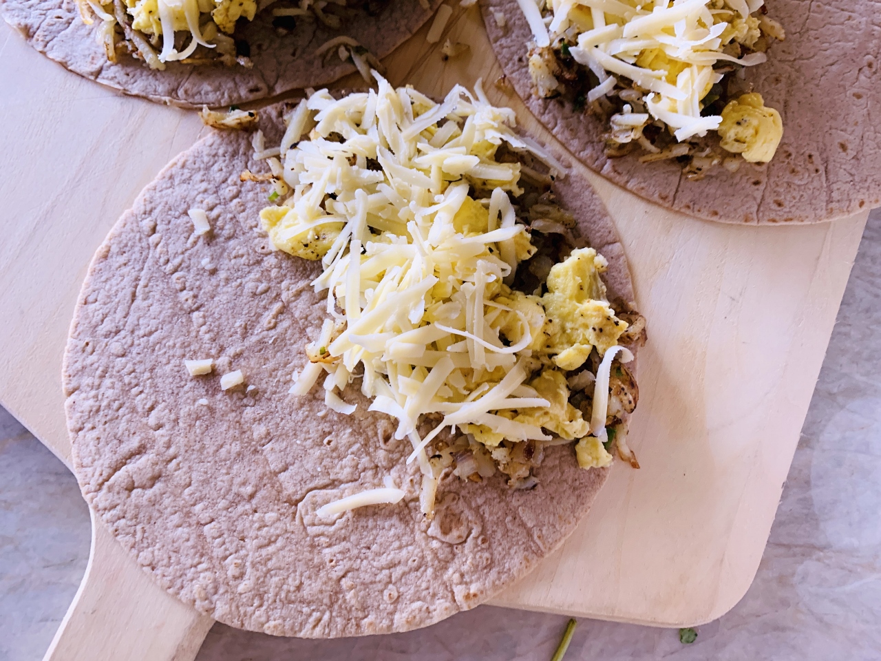 - Place tortillas on board, fill with 1/2 cup hash brown mixture, 1/4 of eggs, and sprinkle with 1/4 of cheese. Fold in half and place in skillet, oiled with a paper towel. Cook over medium heat, only flipping once, about 5 minutes.