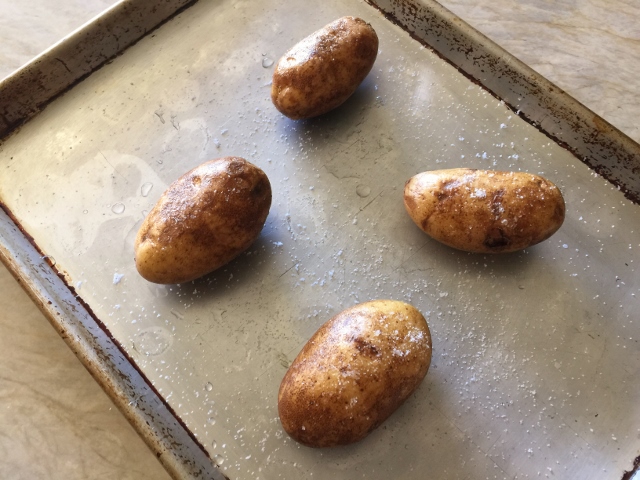 1. Preheat oven to 400 degrees.  Wash potatoes and place on a sheet pan.  While still damp, sprinkle with salt.  Bake in the oven for 50 minutes.  Remove and let cool for 20 minutes.  Turn the oven to broil.