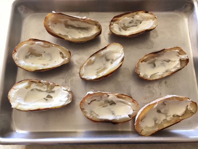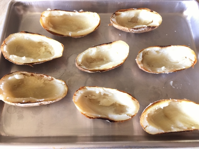 2.  Slice potatoes in half and remove the center with a spoon, leaving 1/4 inch around the perimeter.  Place potatoes back on a sheet pan.