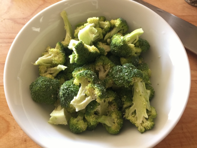3.  Place broccoli in a microwave safe bowl and add 1/2 cup water.  Sprinkle with 1/2 teaspoon salt and onion powder.  Cover with plastic wrap and microwave on high for 4 minutes.  Remove plastic wrap and drain water from bottom of bowl, cool.