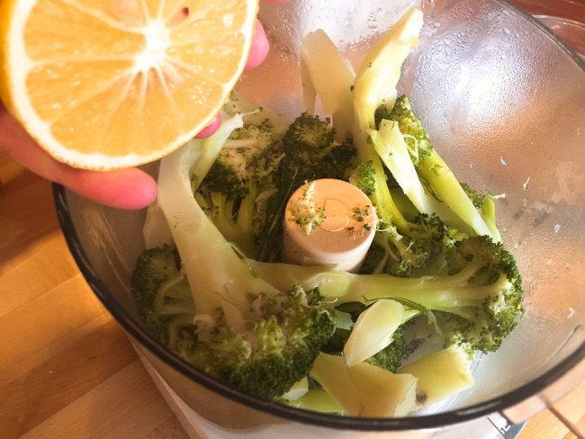 1. Preheat the oven to 375 degrees. Cut broccoli into pieces and steam on stove top or microwave, until fork tender. Drain from water and place in a food processor. Squeeze in lemon juice and pulse, until coarse texture.