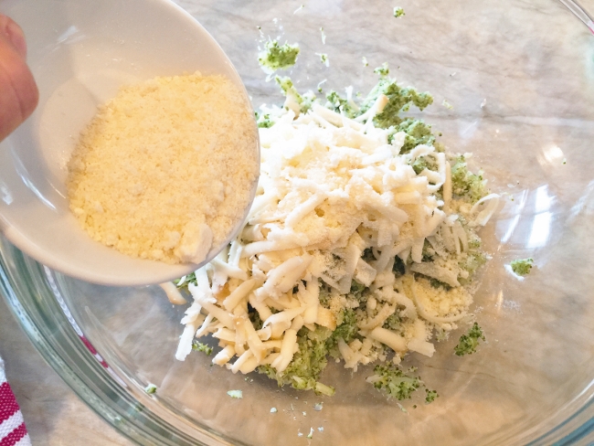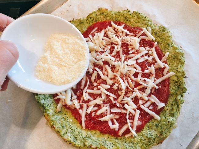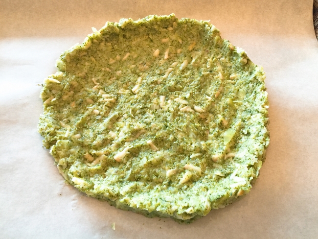 2. Dump the broccoli mixture into a large bowl and add half the mozzarella and Parmesan. Crack in the egg and add the oregano, onion powder, salt and pepper. Using your hands combine the ingredients. Form a 9-inch round with a slight edge on a parchment lined baking sheet.