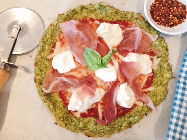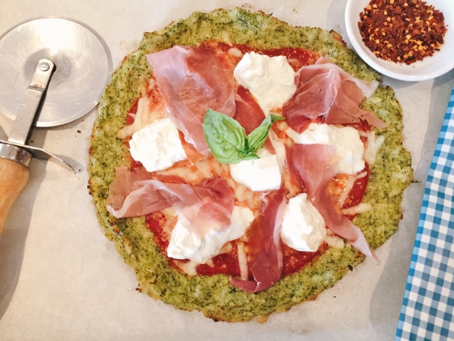 One food most people won’t give up is pizza. Pizza is the number one consumed food in our nation, after hamburgers and it’s not going away anytime soon. The combination of cheese and tangy marinara with a variety of toppings, keeps us coming back for more. However, there are ways to lighten up your pizza, and this Broccoli Crust Burrata & Prosciutto Pizza is fantastic option.